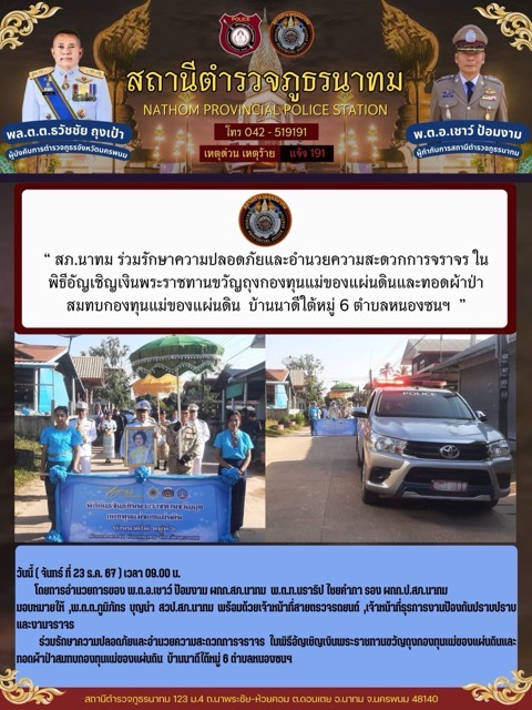 วันนี้ ( 23 ธ.ค.67 ) เวลา 09.00 น.โดยการอำนวยการของ พ.ต.อ.เชาว์ ป้อมงาม ผกก.สภ.นาทม มอบหมายให้ พ.ต.ท.นราธิป ไชยคำกา รอง ผกก.ป.สภ.นาทม มอบหมายให้ ,พ.ต.ต.ภูมิภัทร บุญนำ สวป.สภ.นาทม พร้อมด้วยเจ้าหน้าที่สายตรวจรถยนต์ ,เจ้าหน้าที่ธุรการงานป้องกันปราบปราบและงานจราจร ,คณะกรรมการตรวจสอบและติดตามการบริหารงานตำรวจ (กต.ตร.) สภ.นาทม ร่วมรักษาความปลอดภัยและอำนวยความสะดวกการจราจร ในพิธีอัญเชิญเงินพระราชทานขวัญถุงกองทุนแม่ของแผ่นดินและทอดผ้าป่าสมทบกองทุนแม่ของแผ่นดิน บ้านนาดีใต้ หมู่ 6 ต.หนองซน อ.นาทม จ.นครพนม