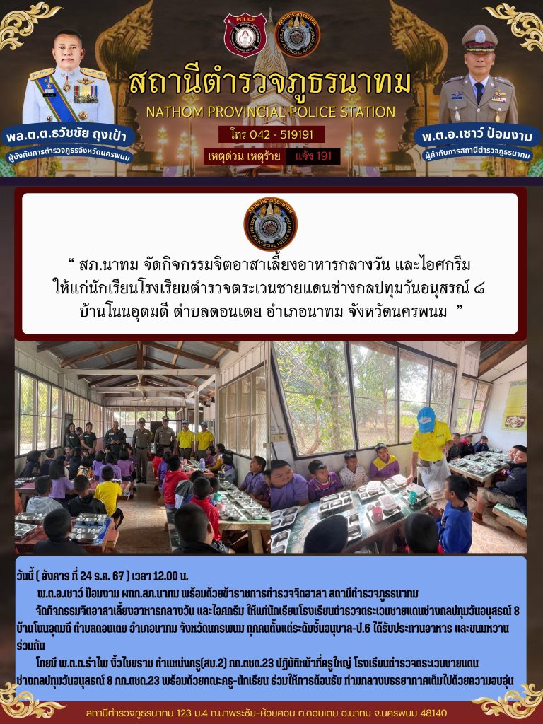 วันนี้ ( อังคาร ที่ 24 ธ.ค. 67 ) เวลา 12.00 น. พ.ต.อ.เชาว์ ป้อมงาม ผกก.สภ.นาทม พร้อมด้วยข้าราชการตำรวจจิตอาสา สถานีตำรวจภูธรนาทม,คณะกรรมการตรวจสอบและติดตามการบริหารงานตำรวจ (กต.ตร.) สภ.นาทม จัดกิจกรรมจิตอาสาเลี้ยงอาหารกลางวัน และไอศกรีม ให้แก่นักเรียนโรงเรียนตำรวจตระเวนชายแดนช่างกลปทุมวันอนุสรณ์ 8 บ้านโนนอุดมดี ตำบลดอนเตย อำเภอนาทม จังหวัดนครพนม ทุกคนตั้งแต่ระดับชั้นอนุบาล-ป.6 ได้รับประทานอาหาร และขนมหวานร่วมกัน โดยมี พ.ต.ต.รำไพ งิ้วไชยราช ตำแหน่งครู(สบ.2) กก.ตชด.23 ปฏิบัติหน้าที่ครูใหญ่ โรงเรียนตำรวจตระเวนชายแดนช่างกลปทุมวันอนุสรณ์ 8 กก.ตชด.23 พร้อมด้วยคณะครู-นักเรียน ร่วมให้การต้อนรับ ท่ามกลางบรรยากาศเต็มไปด้วยความอบอุ่น
