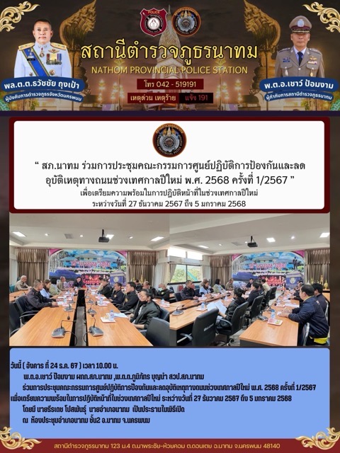 วันนี้ ( อังคาร ที่ 24 ธ.ค. 67 ) เวลา 10.00 น. พ.ต.อ.เชาว์ ป้อมงาม ผกก.สภ.นาทม ,พ.ต.ต.ภูมิภัทร บุญนำ สวป.สภ.นาทม ,คณะกรรมการตรวจสอบและติดตามการบริหารงานตำรวจ (กต.ตร.) สภ.นาทม ร่วมการประชุมคณะกรรมการศูนย์ปฏิบัติการป้องกันและลดอุบัติเหตุทางถนนช่วงเทศกาลปีใหม่ พ.ศ. 2568 ครั้งที่ 1/2567เพื่อเตรียมความพร้อมในการปฎิบัติหน้าที่ในช่วงเทศกาลปีใหม่ ระหว่างวันที่ 27 ธันวาคม 2567 ถึง 5 มกราคม 2568 โดยมี นายธีรเดช โปสพันธุ์ นายอำเภอนาทม เป็นประธานในพิธีเปิด ณ ห้องประชุมอำเภอนาทม ชั้น2 อ.นาทม จ.นครพนม