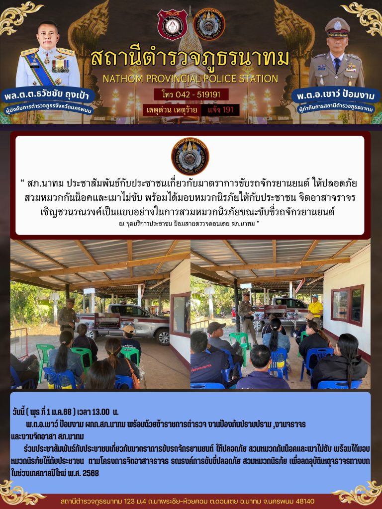 วันนี้ ( พุธ ที่ 1 ม.ค.68 ) เวลา 13.00 น. พ.ต.อ.เชาว์ ป้อมงาม ผกก.สภ.นาทม พร้อมด้วยข้าราชการตำรวจจิตอาสา สถานีตำรวจภูธรนาทม,คณะกรรมการตรวจสอบและติดตามการบริหารงานตำรวจ (กต.ตร.) สภ.นาทม ร่วมประชาสัมพันธ์กับประชาชนเกี่ยวกับมาตราการขับรถจักรยานยนต์ ให้ปลอดภัย สวมหมวกกันน็อคและเมาไม่ขับ พร้อมได้มอบหมวกนิรภัยให้กับประชาชน ตามโครงการจิตอาสาจราจร รณรงค์การขับขี่ปลอดภัย สวมหมวกนิรภัย เพื่อลดอุบัติเหตุจราจรทางบก ในช่วงเทศกาลปีใหม่ พ.ศ. 2568
