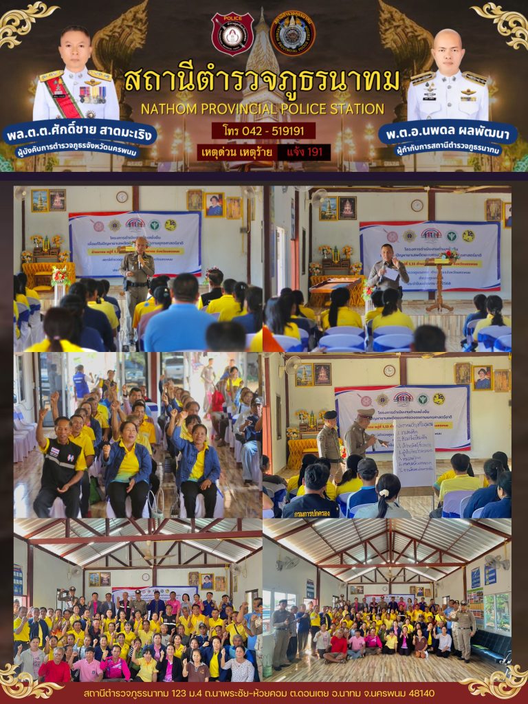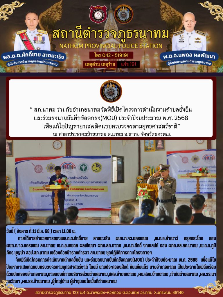 วันนี้ ( อังคาร ที่ 11 มี.ค. 68 ) เวลา 11.00 น.“ พิธีเปิดโครงการดำเนินงานตำบลยั่งยืน เพื่อแก้ไขปัญหายาเสพติดแบบครบวงจรตามยุทธศาสตร์ชาติ ”วันนี้( 11 มี.ค. 68 )เวลา 11.00 น.ภายใต้การอำนวยการของ พล.ต.ต.ศักดิ์ชาย สาดมะเริง ผบก.ภ.จว.นครพนม,พ.ต.อ.สำเนาว์ กรุยกระโทก รอง ผบก.ภ.จว.นครพนมสภ.นาทม นำโดย พ.ต.อ.นพดล ผลพัฒนา ผกก.สภ.นาทม ,พ.ต.ท.ศักดิ์ งามเสน่ห์ รอง ผกก.สส.สภ.นาทม ,พ.ต.ท.ภูมิภัทร บุญนำ สวป.สภ.นาทม พร้อมด้วยข้าราชตำรวจ สภ.นาทม ชุดปฏิบัติการตามโครงการฯ และคณะกรรมการตรวจสอบและติดตามการบริหารงานตำรวจ (กต.ตร.)จัดพิธีเปิดโครงการดำเนินงานตำบลยั่งยืน เพื่อแก้ไขปัญหายาเสพติดแบบครบวงจรตามยุทธศาสตร์ชาติ และร่วมลงนามบันทึกข้อตกลง(MOU) ประจำปีงบประมาณ พ.ศ. 2568 ,ประชาคมปัญหาภายในชุมชน โดยมี นายประครองศักดิ์ ขันเพียแก้ว นายอำเภอนาทม เป็นประธานในพิธี ผู้เข้าร่วมพิธี ปลัดอำเภอนาทม ,เจ้าหน้าที่ปกครองอำเภอนาทม ,นายกองค์การบริหารส่วนตำบลนาทม ,สสอ.อำเภอนาทม ,ผอ.สอน.บ้านนาทม ,กำนันตำบลนาทม ,ผอ.รร.นาทมวิทยา ,ผอ.รร.บ้านนาทม ,ผู้ใหญ่บ้าน หมู่ 1 และ หมู่ 11,ผู้นำชุมชนในพื้นที่ตำบลนาทม ,ประชาชนในพื้นที่ และ ข้าราชตำรวจในสังกัดสถานีตำรวจภูธรนาทม ณ ศาลาประชาคมบ้านนาทม ต.นาทม อ.นาทม จังหวัดนครพนม