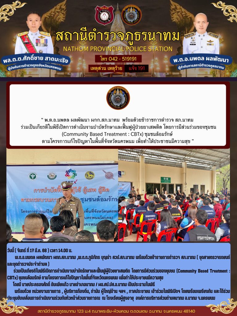 วันนี้ ( จันทร์ ที่ 17 มี.ค. 68 ) เวลา 14.00 น. พ.ต.อ.นพดล ผลพัฒนา ผกก.สภ.นาทม ,พ.ต.ต.ภูมิภัทร บุญนำ สวป.สภ.นาทม พร้อมด้วยข้าราชการตำรวจ สภ.นาทม ( ชุดสายตรวจรถยนต์ และชุดตำรวจประจำตำบล ) และคณะกรรมการตรวจสอบและติดตามการบริหารงานตำรวจ (กต.ตร.)ร่วมเป็นเกียรติในพิธีเปิดการดำเนินงานบำบัดรักษาและฟื้นฟูผู้ป่วยยาเสพติด โดยการมีส่วนร่วมของชุมชน (Community Based Treatment : CBTx) ชุมชนล้อมรักษ์ ตามโครงการแก้ไขปัญหาในพื้นที่จังหวัดนครพนม เพื่อทำให้ประชาชนมีความสุขโดยมี นายประครองศักดิ์ ขันเพียแก้ว นายอำเภอนาทม / ผอ.ศป.ปส.อ.นาทม เป็นประธานในพิธีพร้อมด้วย หน่วยงานราชการ , ผู้บริหารท้องถิ่น, กำนัน ผู้ใหญ่บ้าน ฯลฯ , ภาคประชาชน เข้าร่วมในพิธิเปิดฯ โดยพร้อมเพรียงกัน และได้ร่วมประชุมขับเคลื่อนการดำเนินงานร่วมกับหัวหน้า่ส่วนราชการณ ณ โรงเรียนผู้สูงอายุ องค์การบริหารส่วนตำบลนาทม อ.นาทม จ.นครพนม