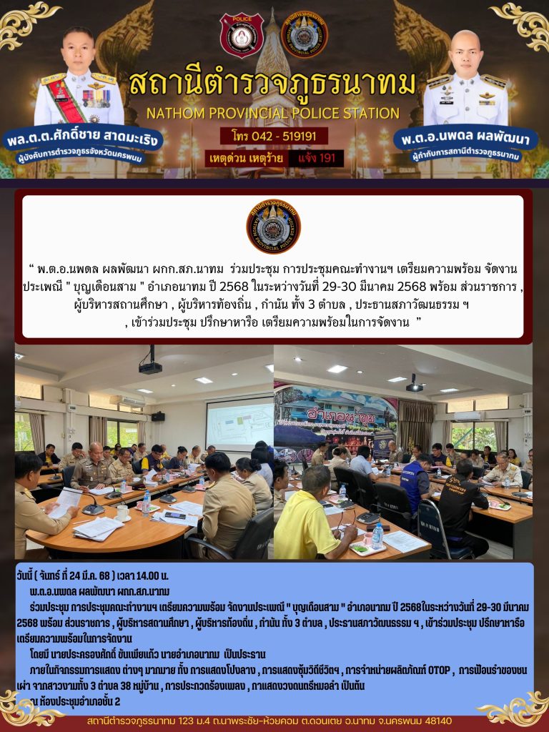 วันนี้ ( จันทร์ ที่ 24 มี.ค. 68 ) เวลา 14.00 น. พ.ต.อ.นพดล ผลพัฒนา ผกก.สภ.นาทม และคณะกรรมการตรวจสอบและติดตามการบริหารงานตำรวจ (กต.ตร.) ร่วมประชุม การประชุมคณะทำงานฯ เตรียมความพร้อม จัดงานประเพณี ” บุญเดือนสาม ” อำเภอนาทม ปี 2568ในระหว่างวันที่ 29-30 มีนาคม 2568 พร้อม ส่วนราชการ , ผู้บริหารสถานศึกษา , ผู้บริหารท้องถิ่น , กำนัน ทั้ง 3 ตำบล , ประธานสภาวัฒนธรรม ฯ , เข้าร่วมประชุม ปรึกษาหารือ เตรียมความพร้อมในการจัดงานโดยมี นายประครองศักดิ์ ขันเพียแก้ว นายอำเภอนาทม เป็นประธาน ภายในกิจกรรมการแสดง ต่างๆ มากมาย ทั้ง การแสดงโปงลาง , การแสดงซุ้มวิถีชีวิตฯ , การจำหน่ายผลิตภัณฑ์ OTOP , การฟ้อนรำของชนเผ่า จากสาวงามทั้ง 3 ตำบล 38 หมู่บ้าน , การประกวดร้องเพลง , การแสดงวงดนตรีหมอลำ เป็นต้นณ ห้องประชุมอำเภอชั้น 2