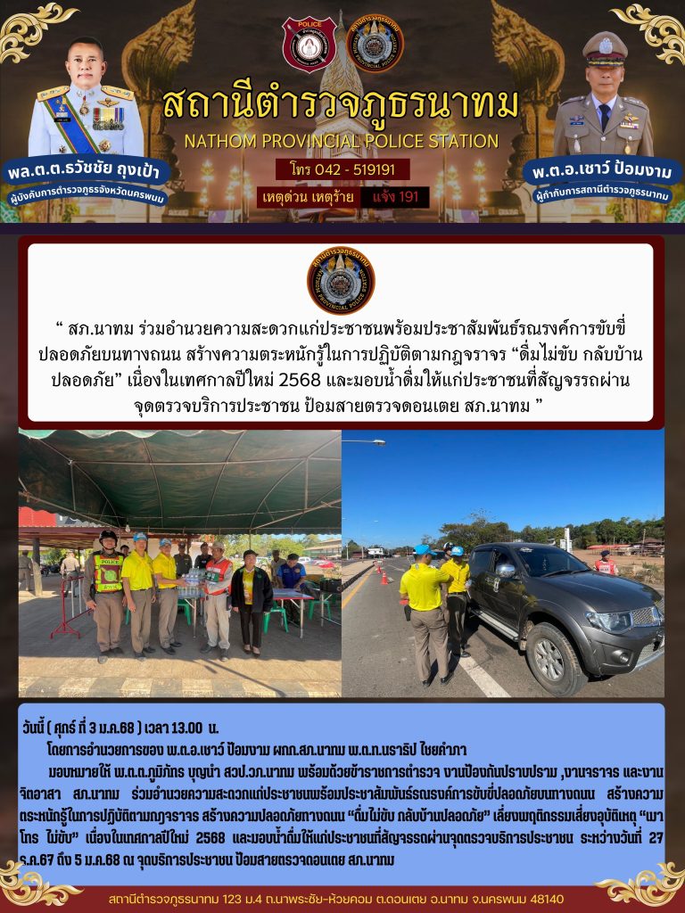 วันนี้ ( ศุกร์ ที่ 3 ม.ค.68 ) เวลา 13.00 น.โดยการอำนวยการของ พ.ต.อ.เชาว์ ป้อมงาม ผกก.สภ.นาทม พ.ต.ท.นราธิป ไชยคำภา มอบหมายให้ พ.ต.ต.ภูมิภัทร บุญนำ สวป.วภ.นาทม พร้อมด้วยข้าราชการตำรวจ งานป้องกันปราบปราม ,งานจราจร ,งานจิตอาสา สภ.นาทม และคณะกรรมการตรวจสอบและติดตามการบริหารงานตำรวจ (กต.ตร.) สภ.นาทม ร่วมอำนวยความสะดวกแก่ประชาชนพร้อมประชาสัมพันธ์รณรงค์การขับขี่ปลอดภัยบนทางถนน สร้างความตระหนักรู้ในการปฏิบัติตามกฎจราจร สร้างความปลอดภัยทางถนน “ดื่มไม่ขับ กลับบ้านปลอดภัย” เลี่ยงพฤติกรรมเสี่ยงอุบัติเหตุ “เมา โทร ไม่ขับ” เนื่องในเทศกาลปีใหม่ 2568 และมอบน้ำดื่มให้แก่ประชาชนที่สัญจรรถผ่านจุดตรวจบริการประชาชน ระหว่างวันที่ 27 ธ.ค.67 ถึง 5 ม.ค.68 ณ จุดบริการประชาชน ป้อมสายตรวจดอนเตย สภ.นาทม