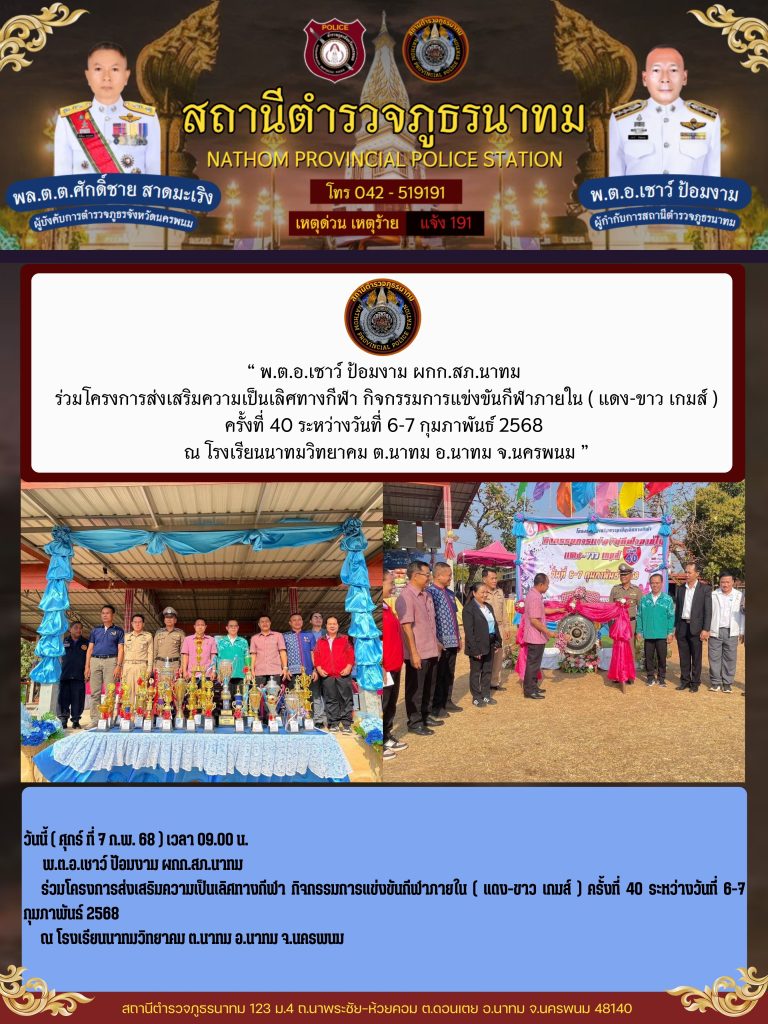 วันที่ ( ศุกร์ ที่ 7 ก.พ. 68 ) เวลา 09.00 น. พ.ต.อ.เชาว์ ป้อมงาม ผกก.สภ.นาทม พ.ต.ต.ภูมิภัทร บุญนำ สวป.วภ.นาทม พร้อมด้วยข้าราชการตำรวจ งานป้องกันปราบปราม ,งานจราจร ,งานจิตอาสา สภ.นาทม และคณะกรรมการตรวจสอบและติดตามการบริหารงานตำรวจ (กต.ตร.) สภ.นาทม ร่วมโครงการส่งเสริมความเป็นเลิศทางกีฬา กิจกรรมการแข่งขันกีฬาภายใน ( แดง-ขาว เกมส์ ) ครั้งที่ 40 ระหว่างวันที่ 6-7 กุมภาพันธ์ 2568ณ โรงเรียนนาทมวิทยาคม ต.นาทม อ.นาทม จ.นครพนม
