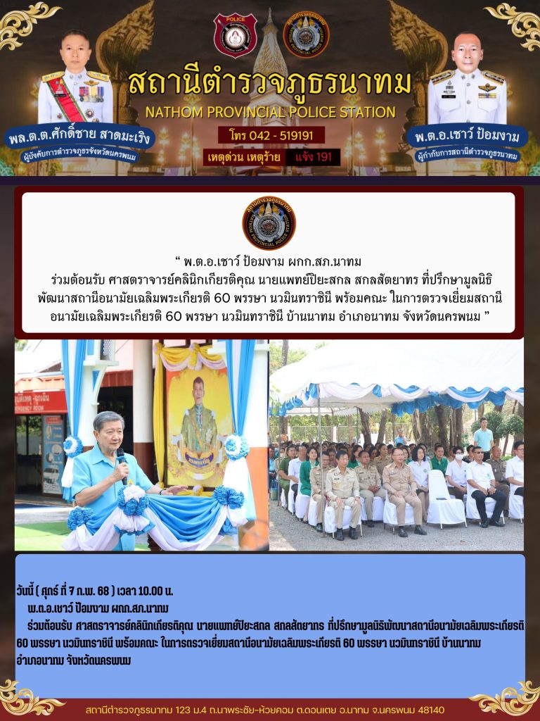 วันที่ ( ศุกร์ ที่ 7 ก.พ. 68 ) เวลา 10.00 น. พ.ต.อ.เชาว์ ป้อมงาม ผกก.สภ.นาทม พ.ต.ต.ภูมิภัทร บุญนำ สวป.วภ.นาทม พร้อมด้วยข้าราชการตำรวจ งานป้องกันปราบปราม ,งานจราจร ,งานจิตอาสา สภ.นาทม และคณะกรรมการตรวจสอบและติดตามการบริหารงานตำรวจ (กต.ตร.) สภ.นาทม ร่วมต้อนรับ ศาสตราจารย์คลินิกเกียรติคุณ นายแพทย์ปิยะสกล สกลสัตยาทร ที่ปรึกษามูลนิธิพัฒนาสถานีอนามัยเฉลิมพระเกียรติ 60 พรรษา นวมินทราชินี พร้อมคณะ ในการตรวจเยี่ยมสถานีอนามัยเฉลิมพระเกียรติ 60 พรรษา นวมินทราชินี บ้านนาทม อำเภอนาทม จังหวัดนครพนม