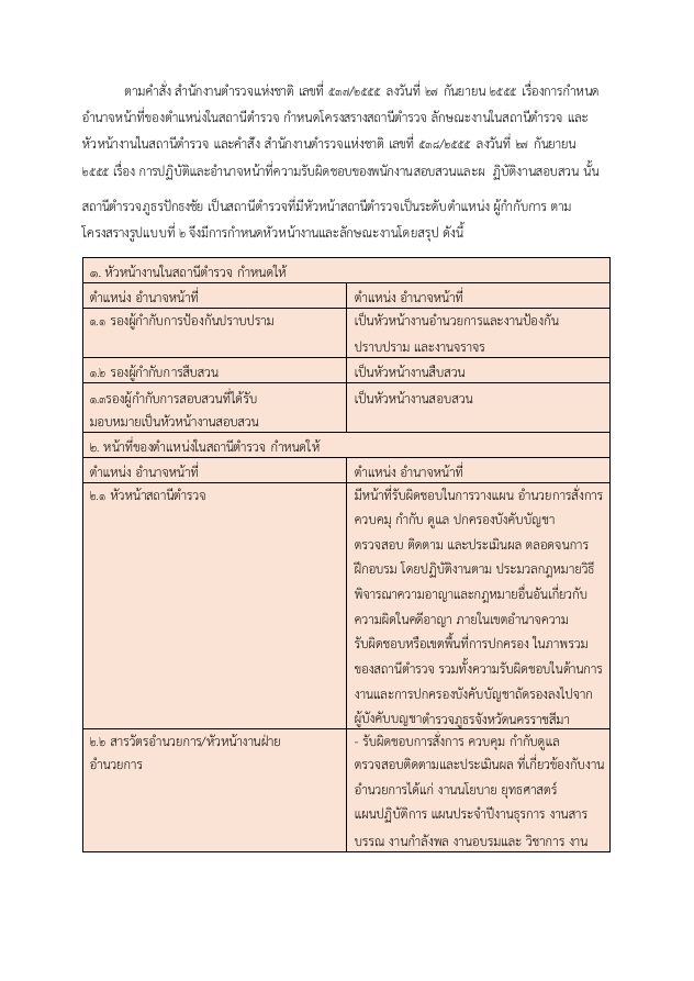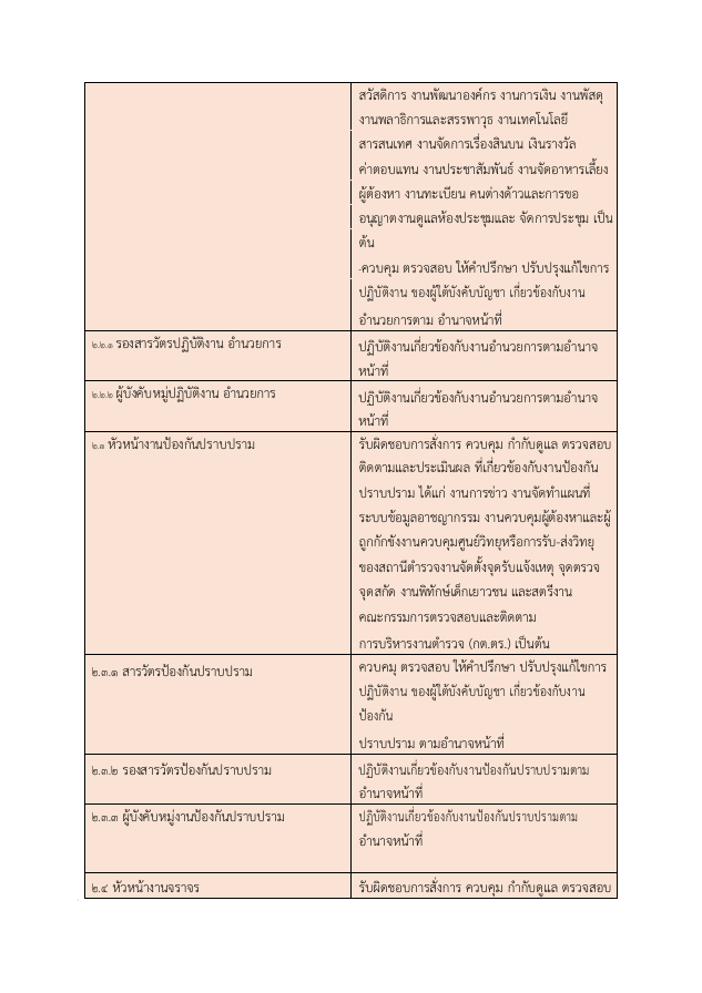 มีหน้าที่เกี่ยวกับการวางแผน อำนวยการ สั่งการ ควบคุม กำกับ ดูแล ตรวจสอบติดตามและประเมินผล ตลอดจนปฏิบัติงานในด้านการป้องกันอาชญากรรมและรักษาความสงบเรียบร้อยงานคณะกรรมการตรวจสอบและติดตามการบริหารงานตำรวจ งานชุมชนและมวลชนสัมพันธ์ในรูปแบบต่าง ๆ รวมทั้งงานที่มีลักษณะเกี่ยวข้องหรือเป็นส่วนประกอบของงานนี้ เพื่อมิให้เกิดอาชญากรรมขึ้นในเขตอำนาจ การรับผิดชอบหรือพื้นที่ปกครองของสถานีตำรวจ
