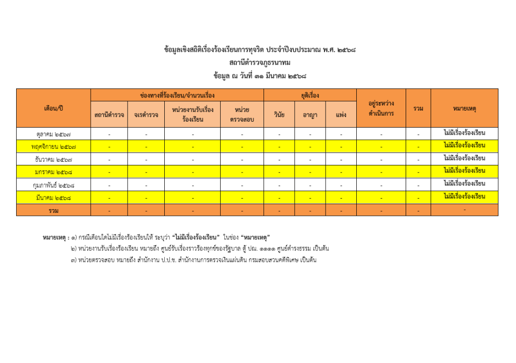 ข้อมูลเชิงสถิติเรื่องร้องเรียนการทุจริต ของ สถานีตำรวจภูธรนาทม ตั้งแต่เดือน ตุลาคม พ.ศ.2567 – มีนาคม พ.ศ.2568